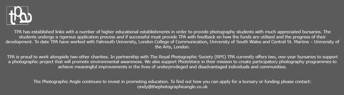 In 2011 – 2012 The Photographic Angle sponsored bursaries to support a photographic project that promotes environmental awareness. The bursaries provided funding for two aspiring photographers to assist with travel expenses, photographic equipment and other project-related costs. The awards were made available for applicants aged 16-25 and 26+ years.