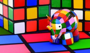 This image makes me chuckle. I remember Elmer the elephant, protagonist of many a children’s book, from when my son was in Primary School. It never occurred to me that the perfect place for Elmer to be camouflaged, would be with a collection of Rubiks cubes, which I remember from being a teenager.